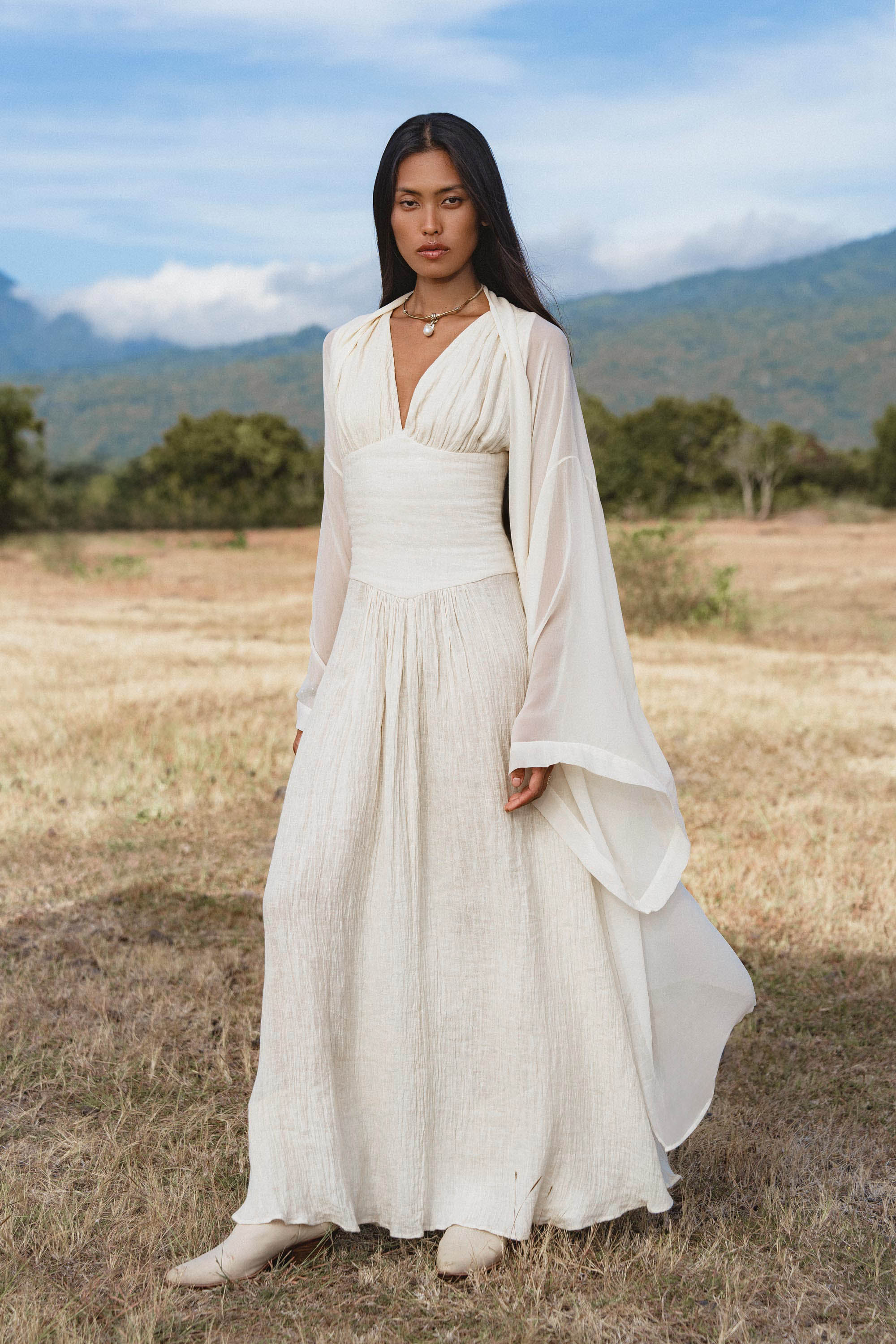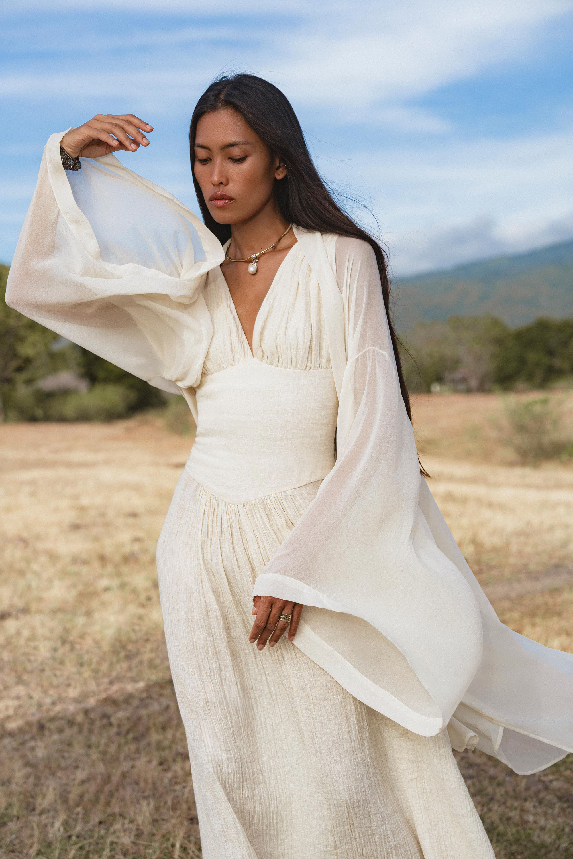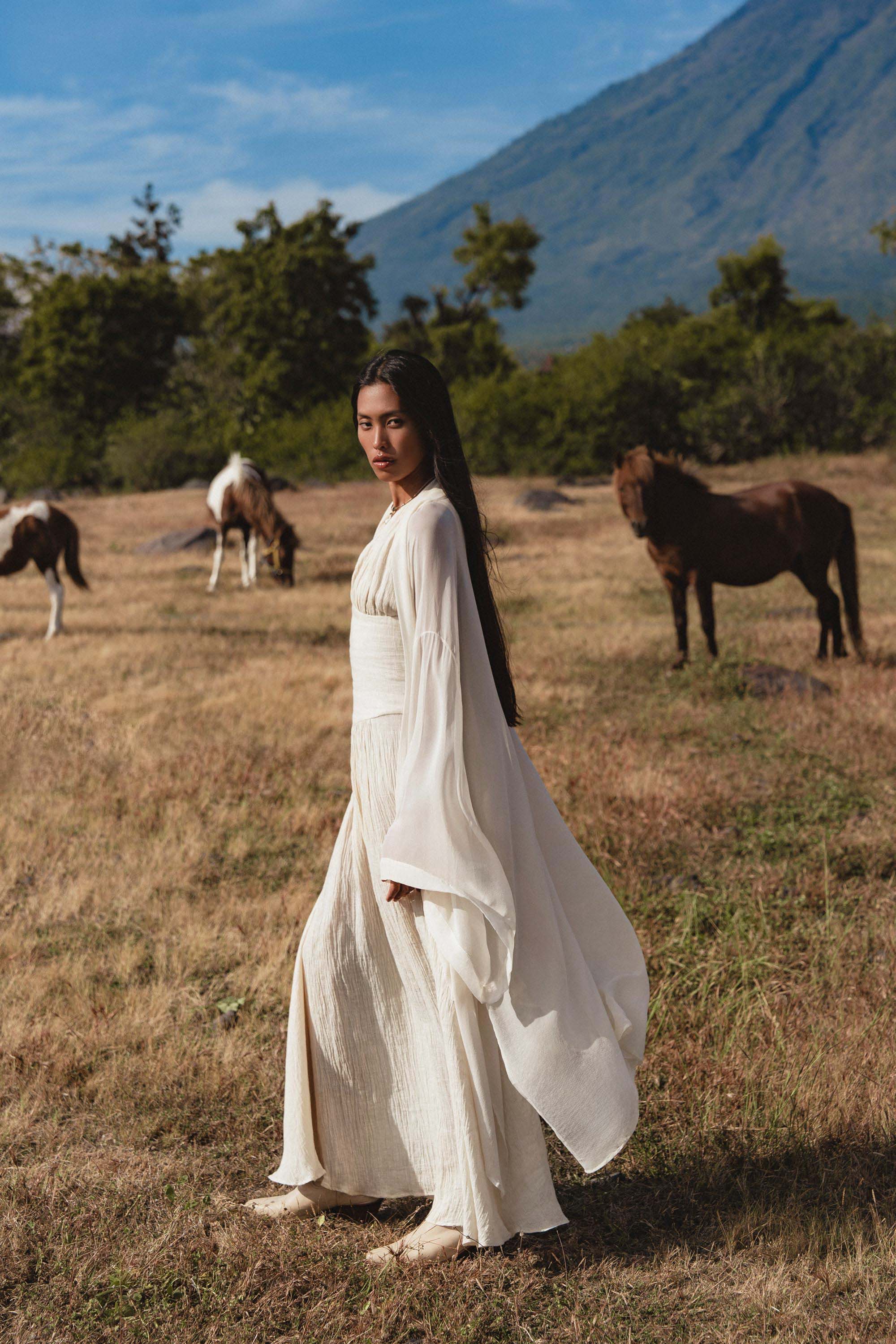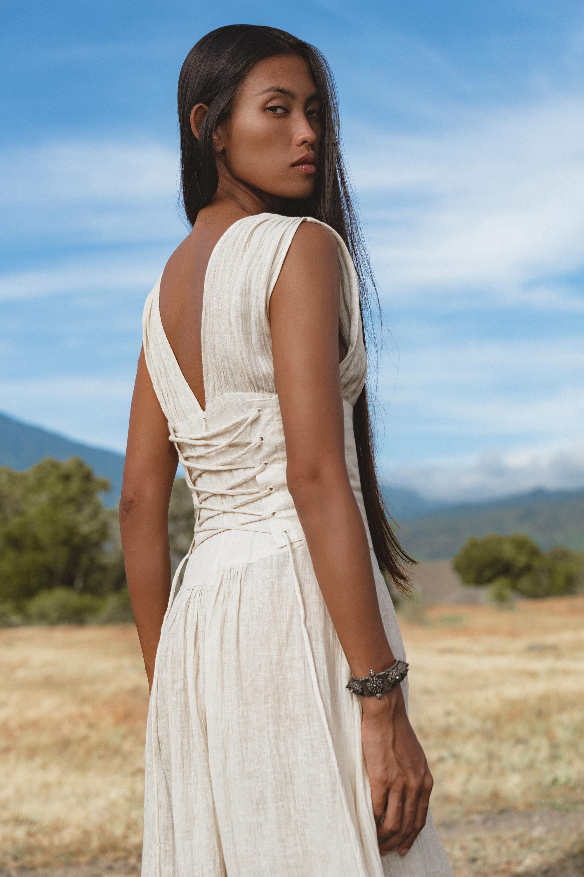 Created from fine linen with a living, breathable texture, this dress seems to dissolve on the body, offering a sense of weightlessness and quiet ease.