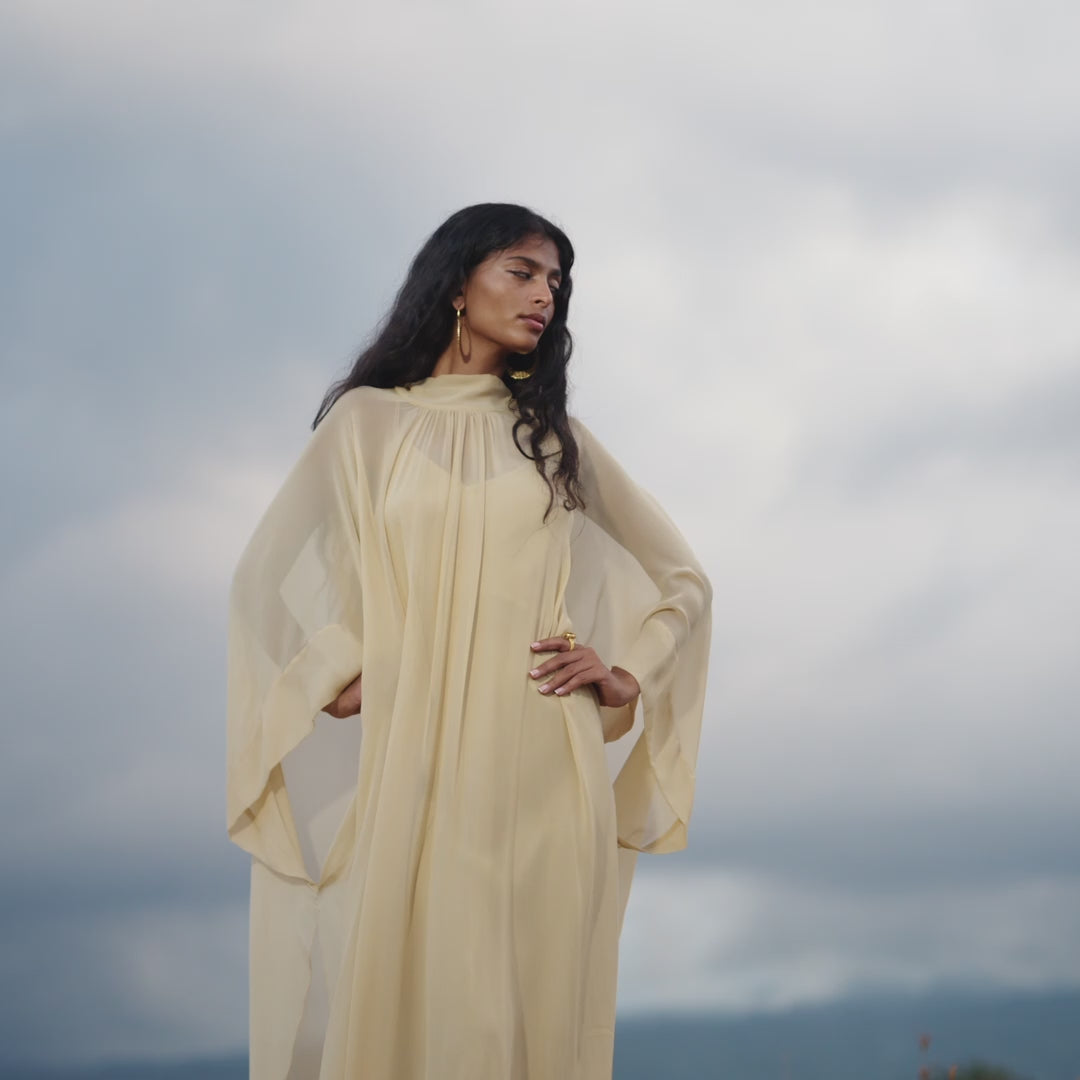 A hymn to divine femininity — the Mahadevi Dress is crafted from pure silk chiffon, a fabric so delicate it feels almost weightless.