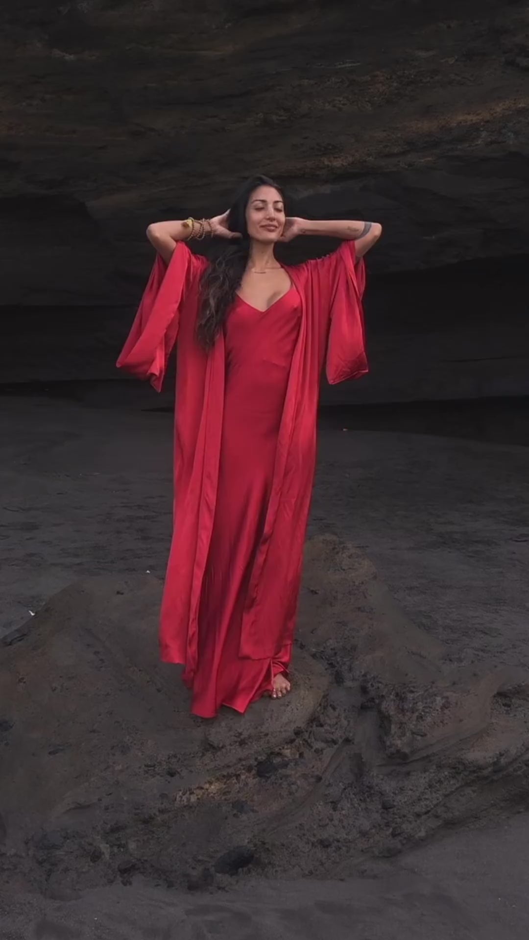Wine Red Silk Boho Kimono Cover • Wide Sleeve Bohemian Kaftan Cardigan